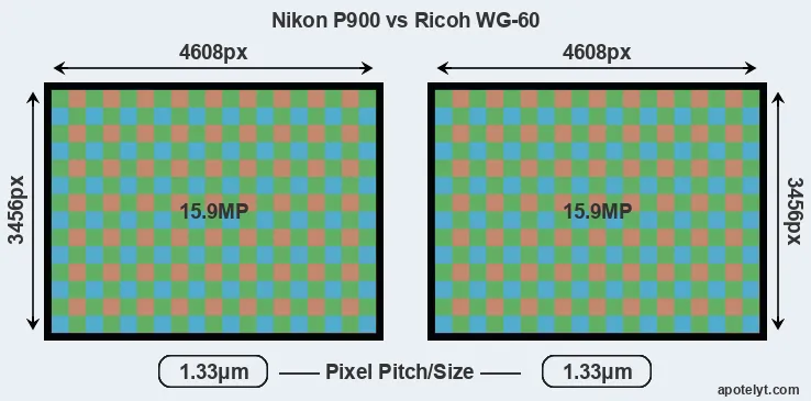 | Sensor Specs | Nikon P900 | Ricoh WG-60 |
