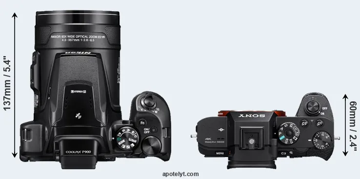 The physical size and weight of the Nikon P900 and the Sony A7S II are illustrated in the side-by-side display below. The two cameras are presented according to their relative size. Three consecutive perspectives from the front, the top, and the back are available. All width, height and depth dimensions are rounded to the nearest millimeter.