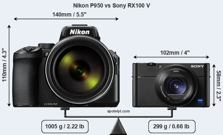 An illustration of the physical size and weight of the Nikon P950 and the Sony RX100 V is provided in the side-by-side display below. The two cameras are presented according to their relative size. Three consecutive views from the front, the top, and the rear side are shown. All width, height and depth measures are rounded to the nearest millimeter.