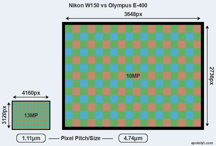 Despite having a smaller sensor, the Nikon W150 offers a higher resolution of 13 megapixels, compared with 10 MP of the Olympus E-400. This megapixels advantage comes at the cost of a higher pixel density and a smaller size of the individual pixel (with a pixel pitch of 1.11μm versus 4.74μm for the E-400). However, it should be noted that the W150 is much more recent (by 12 years and 7 months) than the E-400, and its sensor will have benefitted from technological advances during this time that make it possible to gather light more efficiently. Coming back to sensor resolution, it should be mentioned that the W150 has no anti-alias filter installed, so that it can capture all the detail its sensor resolves.