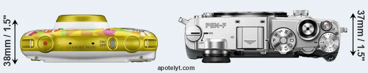 If the front view area (width x height) of the cameras is taken as an aggregate measure of their size, the Olympus PEN-F is notably larger (22 percent) than the Nikon W150. It is worth mentioning in this context that the W150 is splash and dust resistant, while the PEN-F does not feature any corresponding weather-sealing. More than that, the W150 is water-proof up to 10m and can, thus, be used for underwater photography.