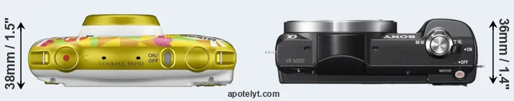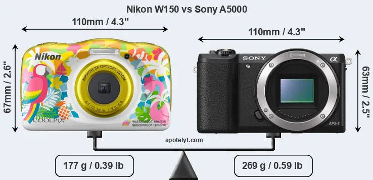 An illustration of the physical size and weight of the Nikon W150 and the Sony A5000 is provided in the side-by-side display below. The two cameras are presented according to their relative size. Three consecutive views from the front, the top, and the rear side are shown. All width, height and depth dimensions are rounded to the nearest millimeter.
