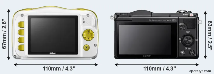 If the front view area (width x height) of the cameras is taken as an aggregate measure of their size, the Sony A5000 is notably smaller (6 percent) than the Nikon W150. It is worth mentioning in this context that the W150 is splash and dust resistant, while the A5000 does not feature any corresponding weather-sealing. More than that, the W150 is water-proof up to 10m and can, thus, be used for underwater photography.