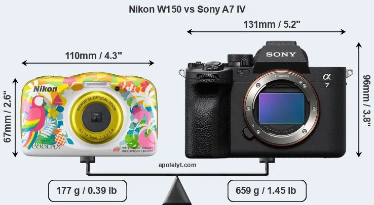 The Nikon Coolpix W150 and the Sony Alpha A7 IV are two digital cameras that were revealed to the public, respectively, in April 2019 and October 2021. The W150 is a fixed lens compact, while the A7 IV is a mirrorless interchangeable lens camera. The cameras are based on a 1/3.1-inch (W150) and a full frame (A7 IV) sensor. The Nikon has a resolution of 13 megapixels, whereas the Sony provides 32.7 MP.
