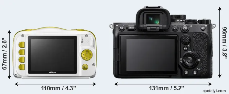 If the front view area (width x height) of the cameras is taken as an aggregate measure of their size, the Sony A7 IV is considerably larger (71 percent) than the Nikon W150. In this context, it is worth noting that both cameras are splash and dust-proof and can, hence, be used in inclement weather conditions or harsh environments. More than that, the W150 is water-proof up to 10m and can, thus, be used for underwater photography.