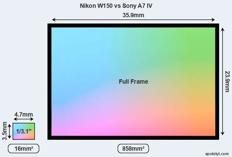 Of the two cameras under consideration, the Nikon W150 features a 1/3.1-inch sensor and the Sony A7 IV a full frame sensor. The sensor area in the A7 IV is 5263 percent bigger. As a result of these sensor size differences, the cameras have a format factor of, respectively, 7.4 and 1.0. The sensor in the W150 has a native 4:3 aspect ratio, while the one in the A7 IV offers a 3:2 aspect.