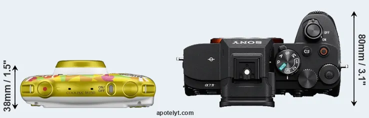 The side-by-side display below illustrates the physical size and weight of the Nikon W150 and the Sony A7 IV. The two cameras are presented according to their relative size. Three consecutive views from the front, the top, and the rear side are shown. All width, height and depth dimensions are rounded to the nearest millimeter.