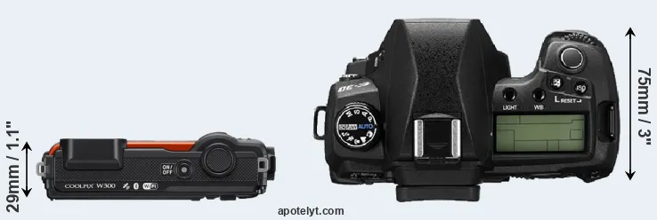 The physical size and weight of the Nikon W300 and the Olympus E-30 are illustrated in the side-by-side display below. The two cameras are presented according to their relative size. Three successive views from the front, the top, and the rear are shown. All width, height and depth dimensions are rounded to the nearest millimeter.