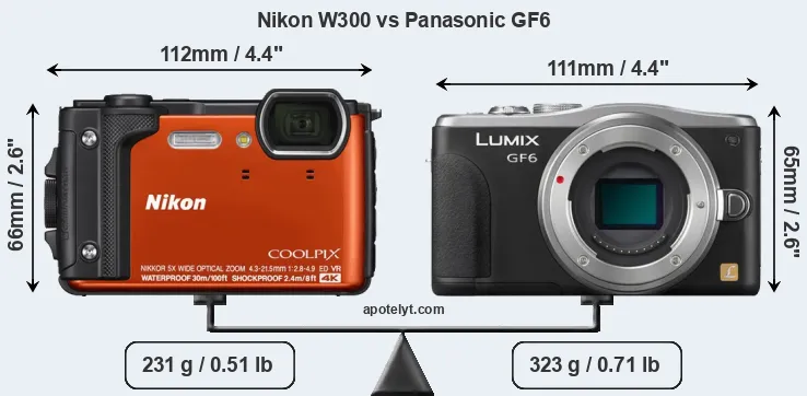 The physical size and weight of the Nikon W300 and the Panasonic GF6 are illustrated in the side-by-side display below. The two cameras are presented according to their relative size. Three successive views from the front, the top, and the rear are shown. All size dimensions are rounded to the nearest millimeter.
