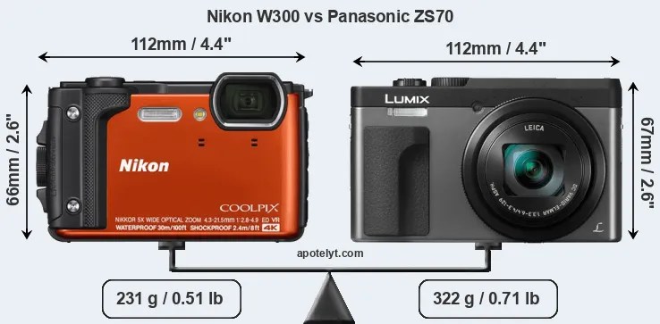 The side-by-side display below illustrates the physical size and weight of the Nikon W300 and the Panasonic ZS70. The two cameras are presented according to their relative size. Three consecutive perspectives from the front, the top, and the back are available. All width, height and depth measures are rounded to the nearest millimeter.