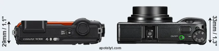 If the front view area (width x height) of the cameras is taken as an aggregate measure of their size, the Ricoh GR III is notably smaller (9 percent) than the Nikon W300. However, the GR III is markedly heavier (11 percent) than the W300. It is worth mentioning in this context that the W300 is splash and dust resistant, while the GR III does not feature any corresponding weather-sealing. More than that, the W300 is water-proof up to 30m and can, thus, be used for underwater photography.