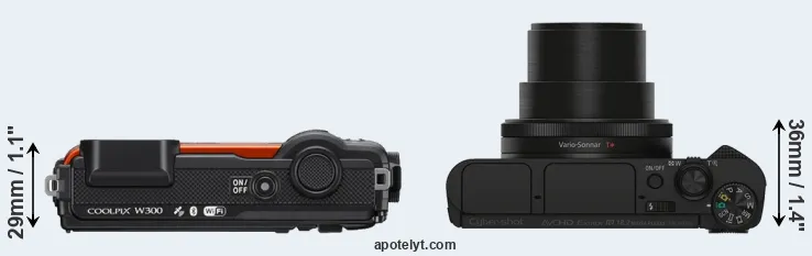 The side-by-side display below illustrates the physical size and weight of the Nikon W300 and the Sony HX90V. The two cameras are presented according to their relative size. Three successive views from the front, the top, and the rear are shown. All size dimensions are rounded to the nearest millimeter.