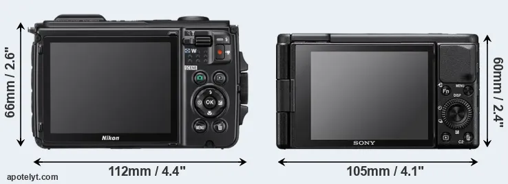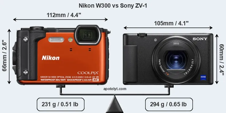 An illustration of the physical size and weight of the Nikon W300 and the Sony ZV-1 is provided in the side-by-side display below. The two cameras are presented according to their relative size. Three consecutive perspectives from the front, the top, and the back are available. All width, height and depth measures are rounded to the nearest millimeter.