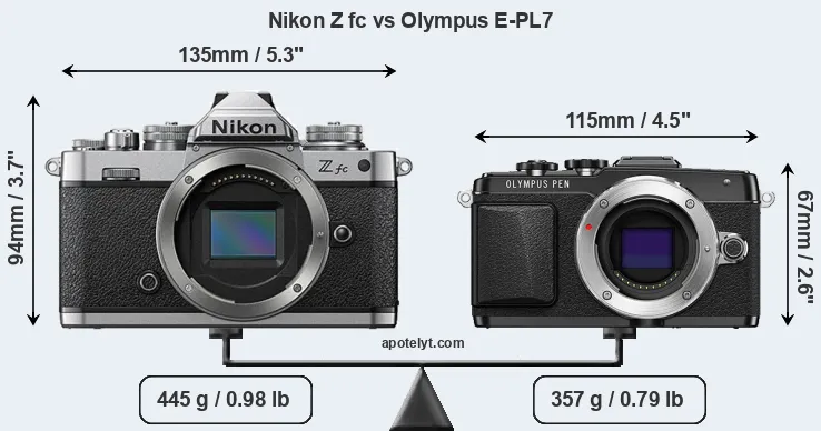 An illustration of the physical size and weight of the Nikon Z fc and the Olympus E-PL7 is provided in the side-by-side display below. The two cameras are presented according to their relative size. Three consecutive perspectives from the front, the top, and the back are available. All width, height and depth dimensions are rounded to the nearest millimeter.
