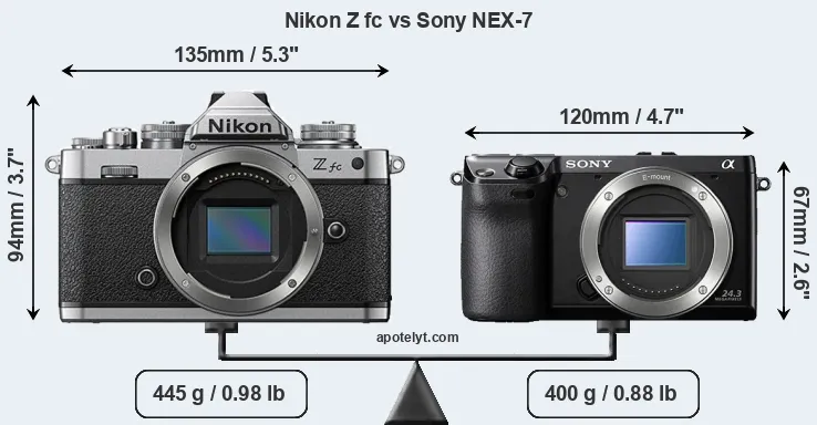 An illustration of the physical size and weight of the Nikon Z fc and the Sony NEX-7 is provided in the side-by-side display below. The two cameras are presented according to their relative size. Three successive views from the front, the top, and the rear are shown. All size dimensions are rounded to the nearest millimeter.