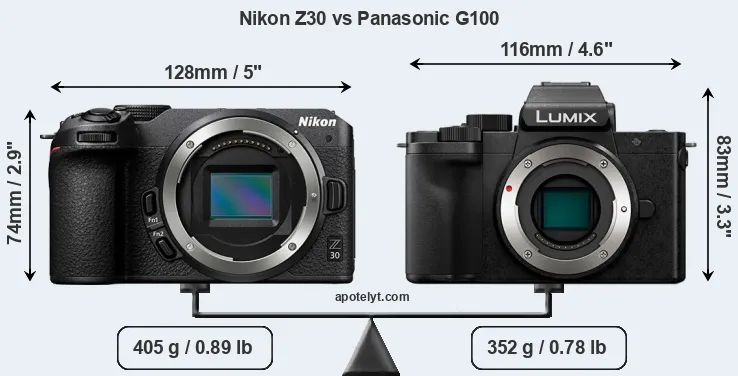 The Nikon Z30 and the Panasonic Lumix DC-G100 (labelled Panasonic G110 in some countries) are two digital cameras that were revealed to the public, respectively, in June 2022 and June 2020. Both the Z30 and the G100 are mirrorless interchangeable lens cameras that are based on an APS-C (Z30) and a Four Thirds (G100) sensor. The Nikon has a resolution of 20.7 megapixels, whereas the Panasonic provides 20.2 MP.