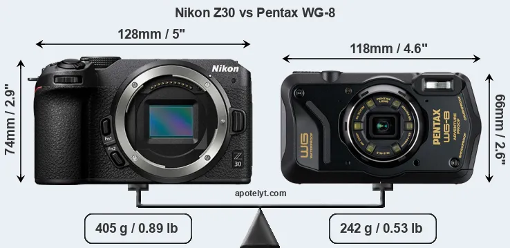 An illustration of the physical size and weight of the Nikon Z30 and the Pentax WG-8 is provided in the side-by-side display below. The two cameras are presented according to their relative size. Three successive views from the front, the top, and the rear are shown. All width, height and depth measures are rounded to the nearest millimeter.