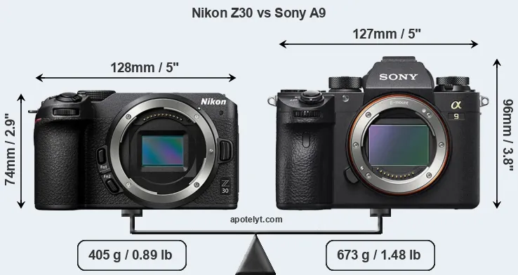 An illustration of the physical size and weight of the Nikon Z30 and the Sony A9 is provided in the side-by-side display below. The two cameras are presented according to their relative size. Three consecutive perspectives from the front, the top, and the back are available. All width, height and depth measures are rounded to the nearest millimeter.