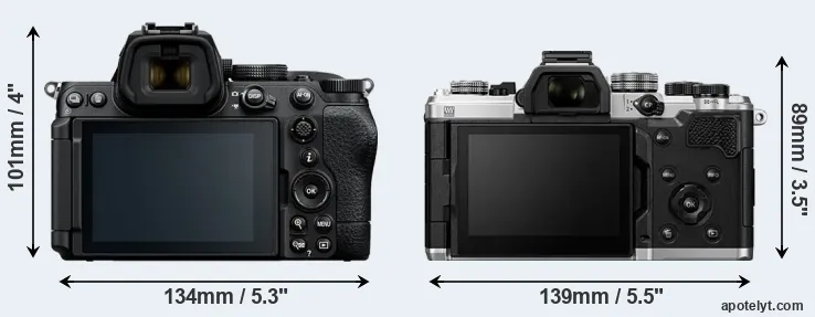 The side-by-side display below illustrates the physical size and weight of the Nikon Z5 II and the OM System OM-3. The two cameras are presented according to their relative size. Three consecutive perspectives from the front, the top, and the back are available. All width, height and depth dimensions are rounded to the nearest millimeter.