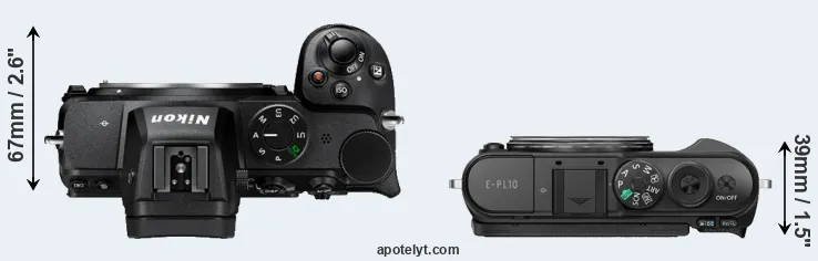The side-by-side display below illustrates the physical size and weight of the Nikon Z5 and the Olympus E-PL10. The two cameras are presented according to their relative size. Three successive views from the front, the top, and the rear are shown. All width, height and depth dimensions are rounded to the nearest millimeter.