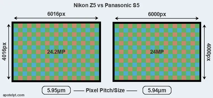 With 24.2MP, the Z5 offers a slightly higher resolution than the S5 (24MP), but the Z5 nevertheless has marginally larger individual pixels (pixel pitch of 5.95μm versus 5.94μm for the S5) due to its larger sensor. It is noteworthy in this context that the two cameras were released in close succession, so that their sensors are from the same technological generation. Coming back to sensor resolution, it should be mentioned that the S5 has no anti-alias filter installed, so that it can capture all the detail its sensor resolves.