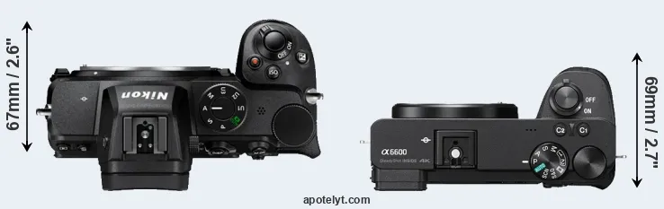 The physical size and weight of the Nikon Z5 and the Sony A6600 are illustrated in the side-by-side display below. The two cameras are presented according to their relative size. Three successive views from the front, the top, and the rear are shown. All width, height and depth measures are rounded to the nearest millimeter.