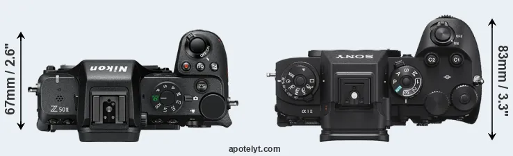 An illustration of the physical size and weight of the Nikon Z50 II and the Sony A1 II is provided in the side-by-side display below. The two cameras are presented according to their relative size. Three consecutive perspectives from the front, the top, and the back are available. All size dimensions are rounded to the nearest millimeter.