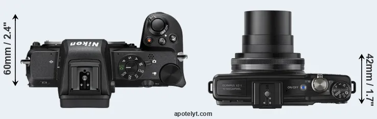 If the front view area (width x height) of the cameras is taken as an aggregate measure of their size, the Olympus XZ-1 is considerably smaller (40 percent) than the Nikon Z50. It is worth mentioning in this context that the Z50 is splash and dust resistant, while the XZ-1 does not feature any corresponding weather-sealing.
