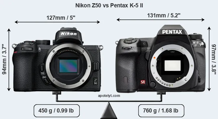 The physical size and weight of the Nikon Z50 and the Pentax K-5 II are illustrated in the side-by-side display below. The two cameras are presented according to their relative size. Three successive views from the front, the top, and the rear are shown. All width, height and depth dimensions are rounded to the nearest millimeter.