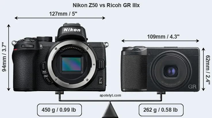 The side-by-side display below illustrates the physical size and weight of the Nikon Z50 and the Ricoh GR IIIx. The two cameras are presented according to their relative size. Three successive views from the front, the top, and the rear are shown. All width, height and depth measures are rounded to the nearest millimeter.