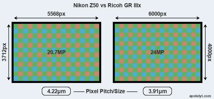 | Sensor Specs | Nikon Z50 | Ricoh GR IIIx |