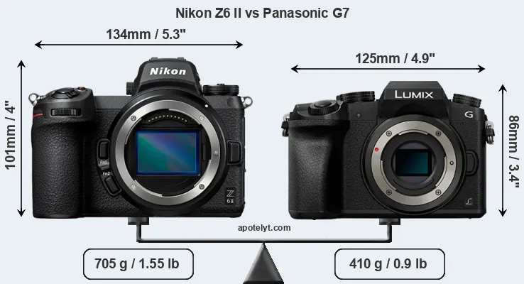 The side-by-side display below illustrates the physical size and weight of the Nikon Z6 II and the Panasonic G7. The two cameras are presented according to their relative size. Three successive views from the front, the top, and the rear are shown. All width, height and depth measures are rounded to the nearest millimeter.