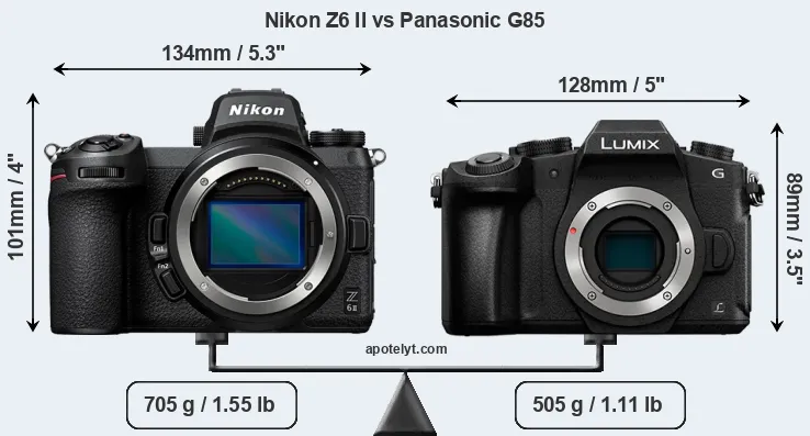 The side-by-side display below illustrates the physical size and weight of the Nikon Z6 II and the Panasonic G85. The two cameras are presented according to their relative size. Three successive views from the front, the top, and the rear are shown. All width, height and depth measures are rounded to the nearest millimeter.