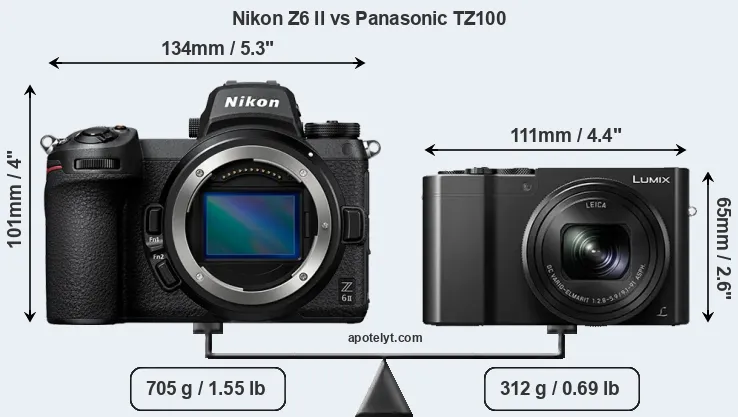 The side-by-side display below illustrates the physical size and weight of the Nikon Z6 II and the Panasonic TZ100. The two cameras are presented according to their relative size. Three consecutive perspectives from the front, the top, and the back are available. All size dimensions are rounded to the nearest millimeter.