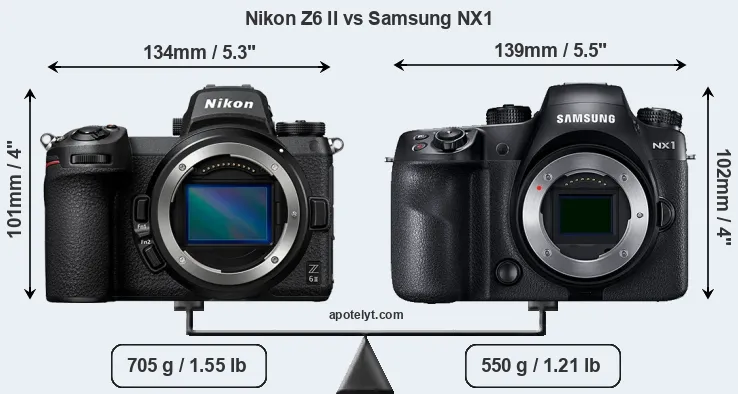 An illustration of the physical size and weight of the Nikon Z6 II and the Samsung NX1 is provided in the side-by-side display below. The two cameras are presented according to their relative size. Three consecutive views from the front, the top, and the rear side are shown. All width, height and depth measures are rounded to the nearest millimeter.