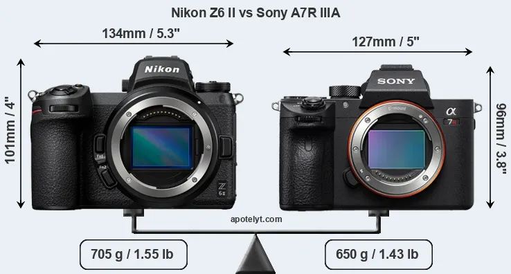 The side-by-side display below illustrates the physical size and weight of the Nikon Z6 II and the Sony A7R IIIA. The two cameras are presented according to their relative size. Three consecutive perspectives from the front, the top, and the back are available. All width, height and depth measures are rounded to the nearest millimeter.