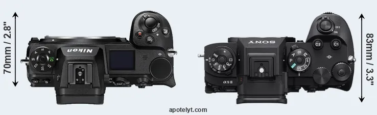 An illustration of the physical size and weight of the Nikon Z6 II and the Sony A9 III is provided in the side-by-side display below. The two cameras are presented according to their relative size. Three consecutive views from the front, the top, and the rear side are shown. All size dimensions are rounded to the nearest millimeter.