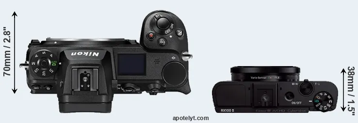 The side-by-side display below illustrates the physical size and weight of the Nikon Z6 II and the Sony RX100 II. The two cameras are presented according to their relative size. Three consecutive perspectives from the front, the top, and the back are available. All width, height and depth measures are rounded to the nearest millimeter.