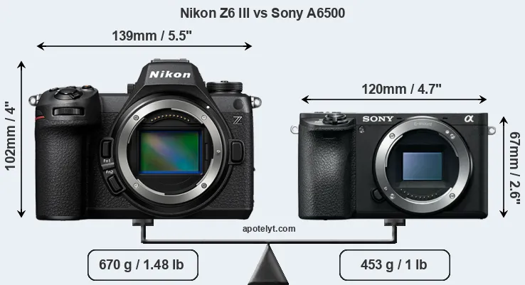 The physical size and weight of the Nikon Z6 III and the Sony A6500 are illustrated in the side-by-side display below. The two cameras are presented according to their relative size. Three successive views from the front, the top, and the rear are shown. All width, height and depth measures are rounded to the nearest millimeter.