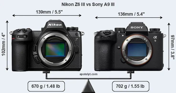 The physical size and weight of the Nikon Z6 III and the Sony A9 III are illustrated in the side-by-side display below. The two cameras are presented according to their relative size. Three consecutive perspectives from the front, the top, and the back are available. All width, height and depth dimensions are rounded to the nearest millimeter.