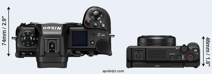 The side-by-side display below illustrates the physical size and weight of the Nikon Z6 III and the Sony ZV-1F. The two cameras are presented according to their relative size. Three successive views from the front, the top, and the rear are shown. All width, height and depth dimensions are rounded to the nearest millimeter.