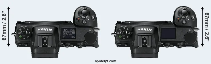 The physical size and weight of the Nikon Z6 and the Nikon Z7 are illustrated in the side-by-side display below. The two cameras are presented according to their relative size. Three consecutive perspectives from the front, the top, and the back are available. All size dimensions are rounded to the nearest millimeter.
