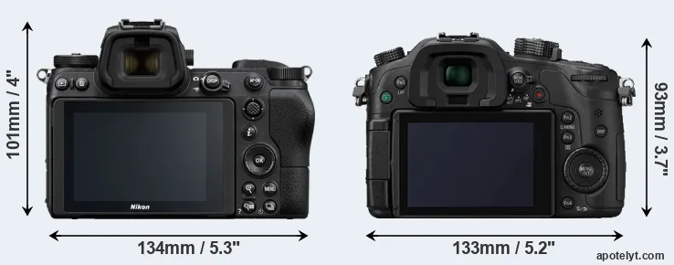 The physical size and weight of the Nikon Z6 and the Panasonic GH4 are illustrated in the side-by-side display below. The two cameras are presented according to their relative size. Three consecutive perspectives from the front, the top, and the back are available. All width, height and depth dimensions are rounded to the nearest millimeter.