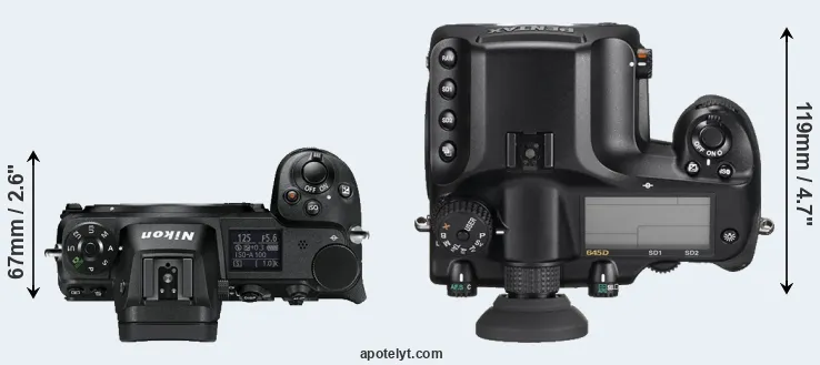 The side-by-side display below illustrates the physical size and weight of the Nikon Z6 and the Pentax 645D. The two cameras are presented according to their relative size. Three consecutive perspectives from the front, the top, and the back are available. All size dimensions are rounded to the nearest millimeter.