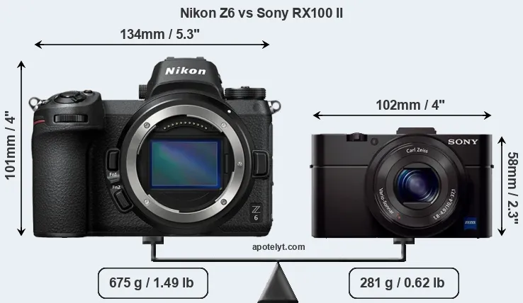 An illustration of the physical size and weight of the Nikon Z6 and the Sony RX100 II is provided in the side-by-side display below. The two cameras are presented according to their relative size. Three successive views from the front, the top, and the rear are shown. All size dimensions are rounded to the nearest millimeter.