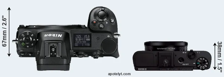 If the front view area (width x height) of the cameras is taken as an aggregate measure of their size, the Sony RX100 II is considerably smaller (56 percent) than the Nikon Z6. It is worth mentioning in this context that the Z6 is splash and dust resistant, while the RX100 II does not feature any corresponding weather-sealing.