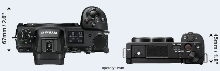 The side-by-side display below illustrates the physical size and weight of the Nikon Z6 and the Sony ZV-E10. The two cameras are presented according to their relative size. Three successive views from the front, the top, and the rear are shown. All width, height and depth dimensions are rounded to the nearest millimeter.