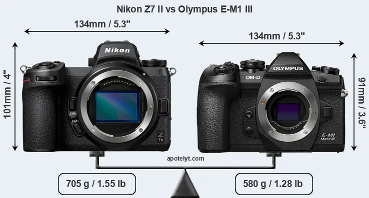 An illustration of the physical size and weight of the Nikon Z7 II and the Olympus E-M1 III is provided in the side-by-side display below. The two cameras are presented according to their relative size. Three consecutive perspectives from the front, the top, and the back are available. All width, height and depth dimensions are rounded to the nearest millimeter.