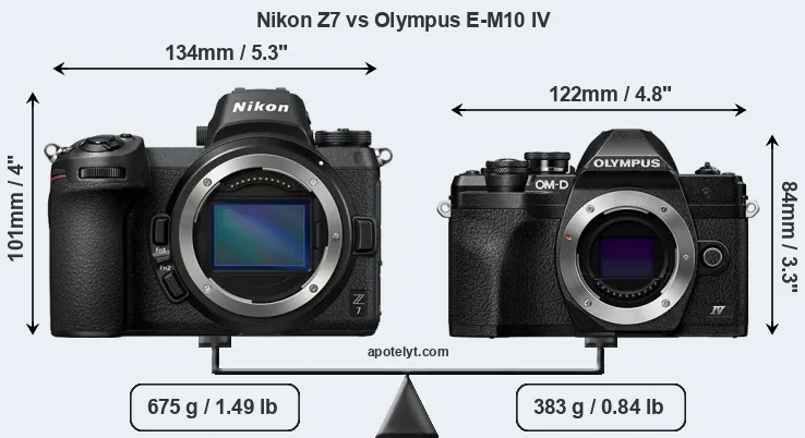 The side-by-side display below illustrates the physical size and weight of the Nikon Z7 and the Olympus E-M10 IV. The two cameras are presented according to their relative size. Three consecutive perspectives from the front, the top, and the back are available. All width, height and depth dimensions are rounded to the nearest millimeter.