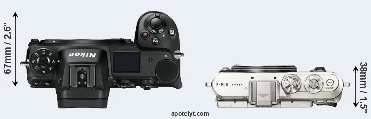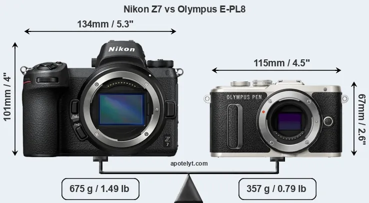 The side-by-side display below illustrates the physical size and weight of the Nikon Z7 and the Olympus E-PL8. The two cameras are presented according to their relative size. Three consecutive views from the front, the top, and the rear side are shown. All width, height and depth dimensions are rounded to the nearest millimeter.